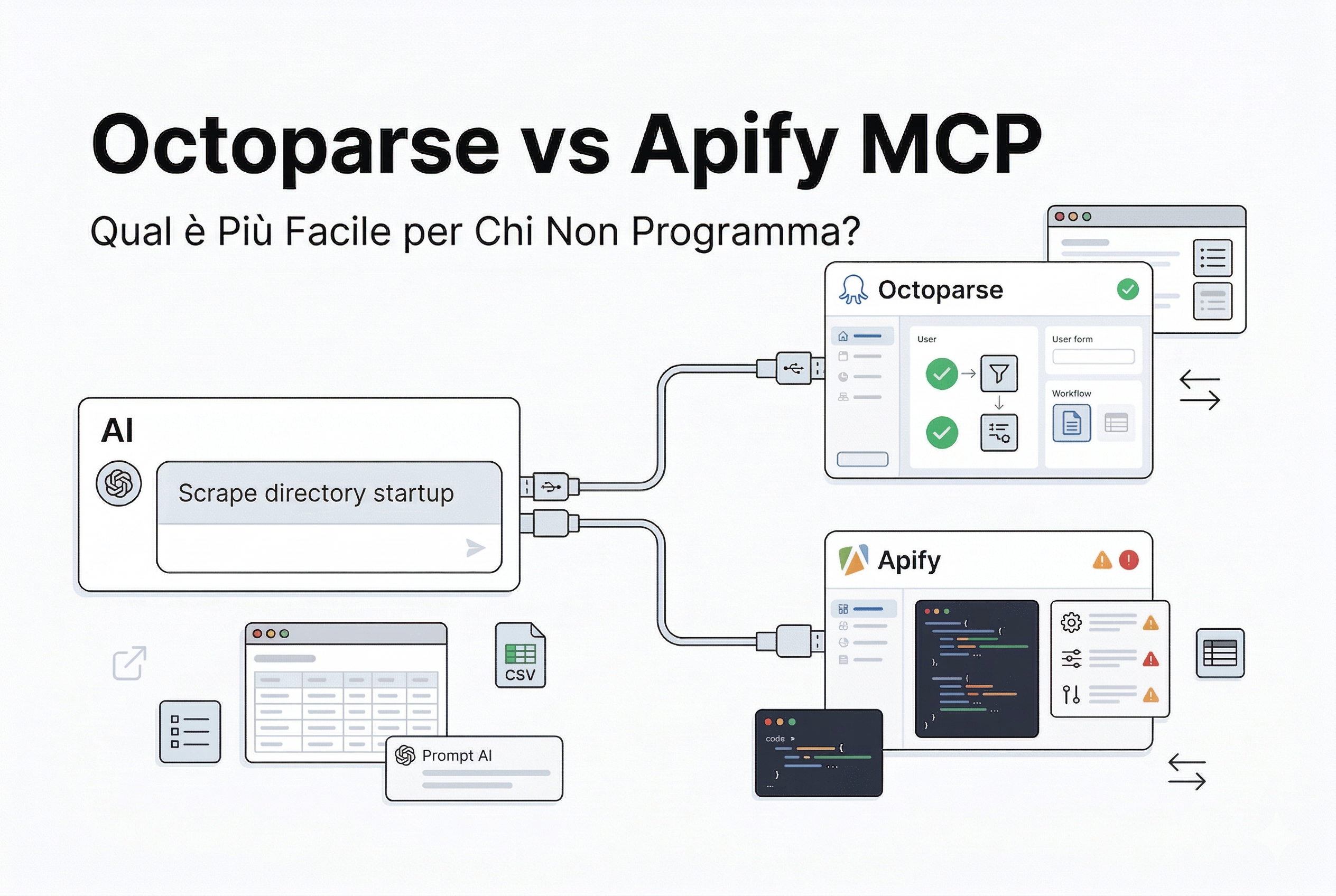 Scopri come fare web scraping con MCP integrando l'IA. Confronto tra Octoparse e Apify per organizzare dati non strutturati e arricchimento dati B2B.