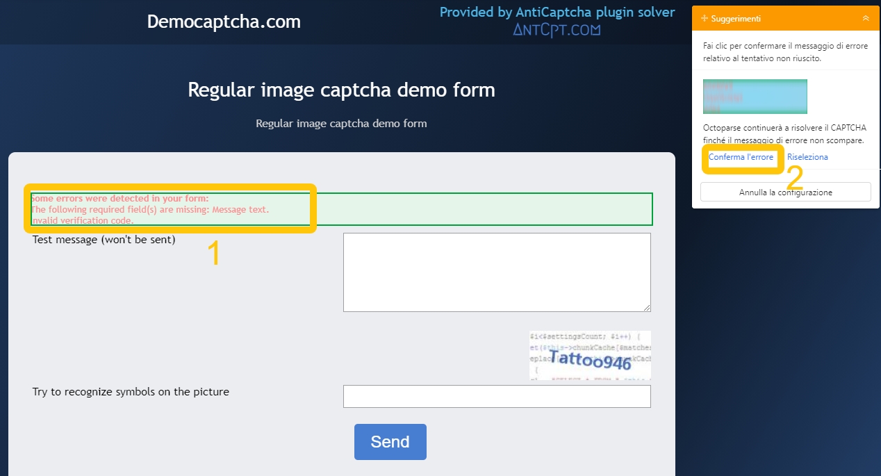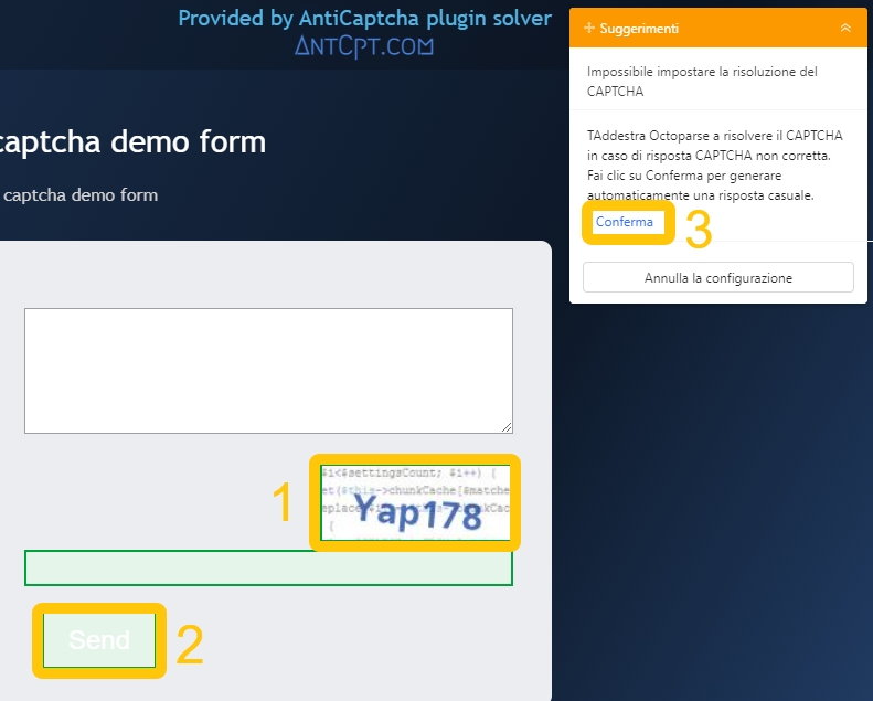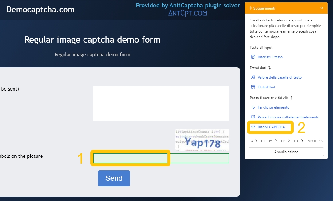 Seleziona Risolvi CAPTCHA sul pannello dei suggerimenti e clicca sull’immagine. Successivamente, clicca sul pulsante Send per continuare. Infine, clicca su Conferma nel pannello dei suggerimenti.